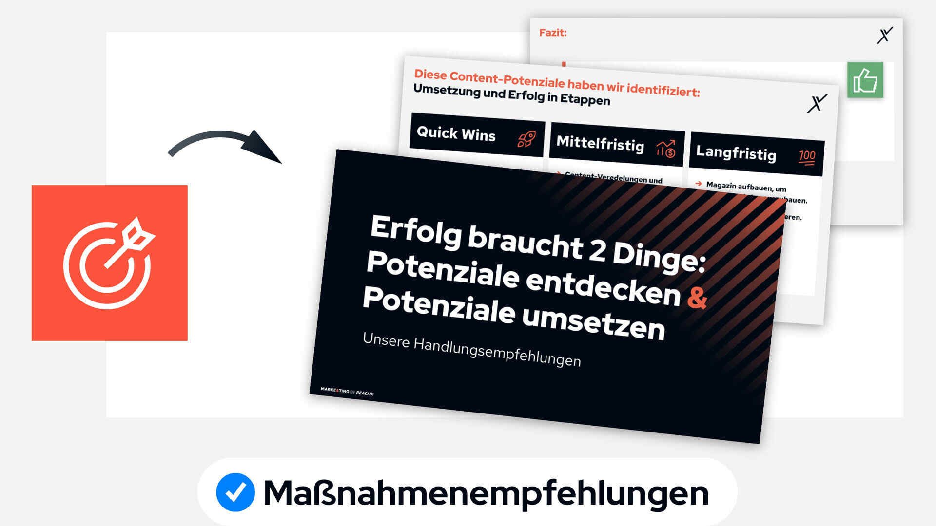 Du kennst nun deine Potenziale und willst wissen, wie du diese umsetzen kannst. Das verraten wir dir mit unseren Empfehlungen. Diese basieren auf unseren Erfahrungswerten und sollen dir als Entscheidungsgrundlage dienen für dein weiteres Vorgehen im Marketing deines Unternehmens.