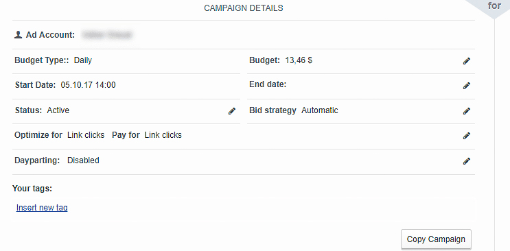 Wenn du z. B. mit dem Tool AdEspresso arbeitest, kannst du das Kampagnenbudget unter dem Reiter „Ad Einstellungen“ anpassen. Klicke bei der entsprechenden Kampagne auf das Stift-Symbol rechts neben dem Namen – dort lassen sich die Budgeteinstellungen bequem ändern.