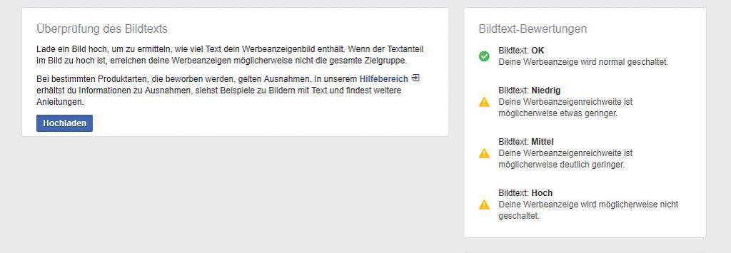 Facebook stellt ein eigenes Tool zur Verfügung, das die Rechtmäßigkeit eines Bildes prüft, das „Text Overlay Tool“. Es bewertet jedes Bild individuell nach Textanteil. Als Ergebnis erhält man eine der folgenden Kategorien: wenig, mittel, hoch und ok. Speziell bei mittel und hoch sollte eine Änderung vorgenommen werden.