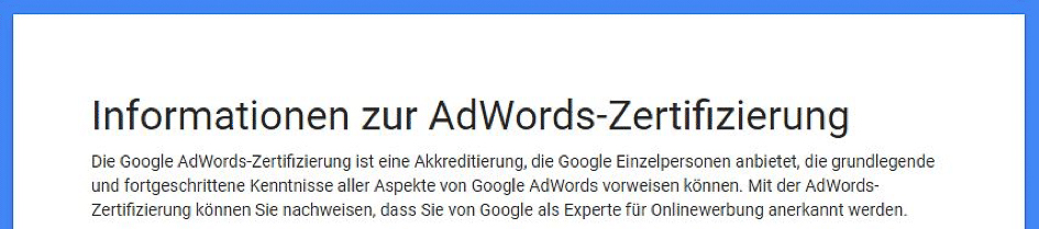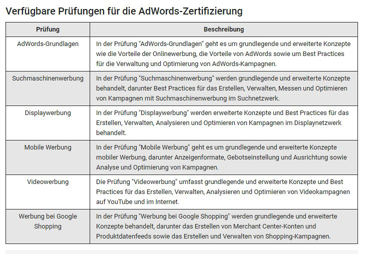 Google hat sich dafür etwas einfallen lassen und eine eigene AdWords Zertifizierung erstellt. Nach der erfolgreichen Ablegung der Prüfung bekommt jeder ein personalisiertes Zertifikat ausgestellt, das dann jeder Bewerbung beigelegt werden kann. Durch die standardisierten Prüfungen kann sich jeder Arbeitgeber sicher sein, dass die Skills auch tatsächlich vorhanden sind.