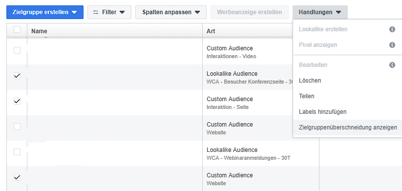 → Klicken Sie dann unter „Handlungen“ auf „Zielgruppenüberschneidung anzeigen“.